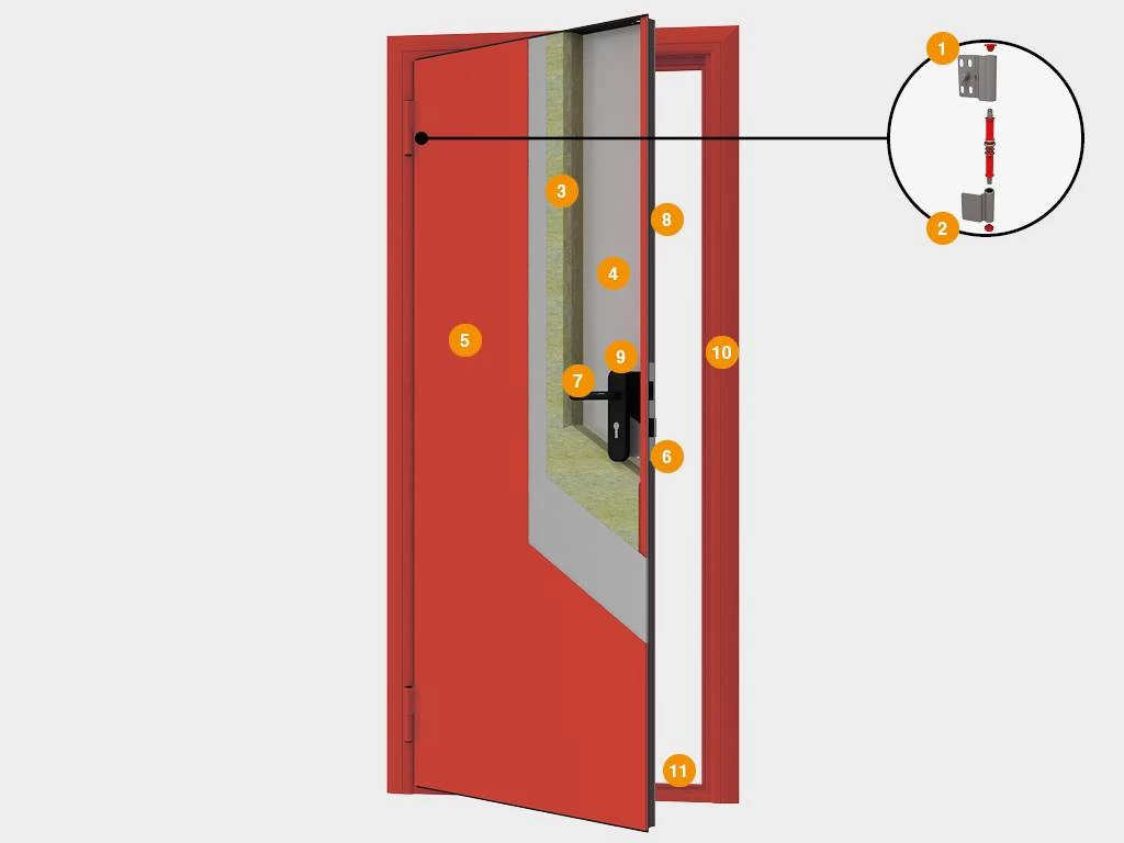 Противопожарные двери DoorHan комплектуются стальной подпружиненной ручкой с нейлоновым покрытием и односистемным замком с цилиндровым механизмом «ключ-ключ». Дополнительно могут быть укомплектованы врезными окнами, замком с системой «антипаника», вентиляционной решеткой, накладкой для защиты полотна от повреждений, доводчиком, выпадающим порогом.